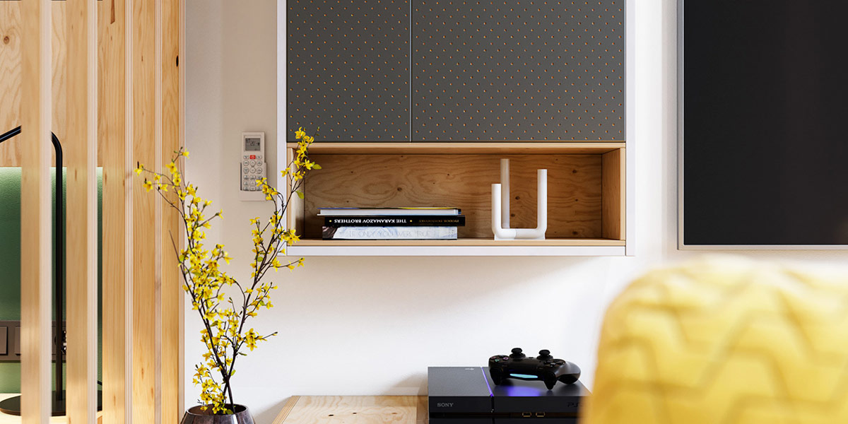 Căn hộ này có diện tích 30 m2, được thiết kế cho người đàn ông độc thân. Màu vàng sáng rực rỡ nổi bật xung quanh nội thất tông màu lạnh, đen và trắng.