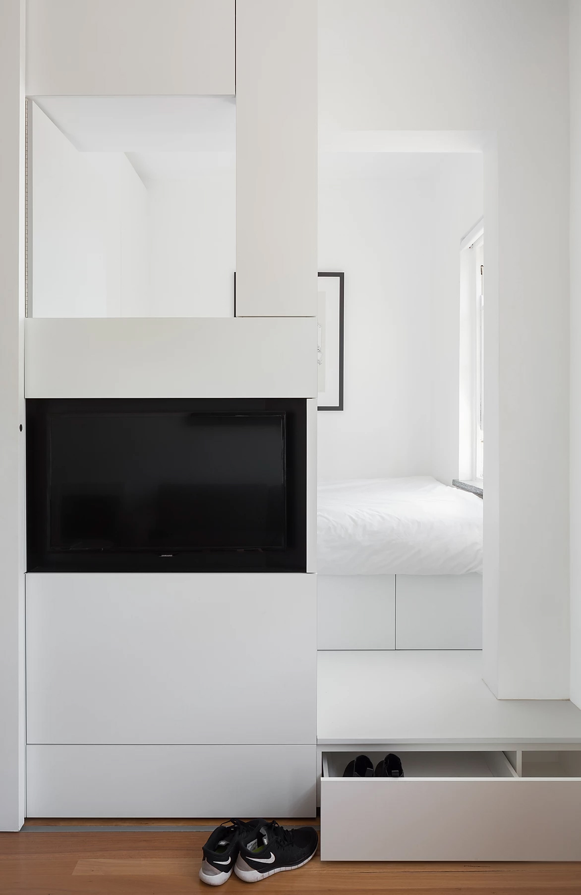 Bố trí hợp lý không gian cho các căn hộ có diện tích siêu nhỏ dưới 30m2 đã làm cho công năng sử dụng được đầy đủ. Sử dụng thông minh các cửa, vách ngăn trượt để che giấu các khu vực chức năng khác nhau, tạo nên không gian sống tinh tế, độc đáo, vượt xa mong đợi so với diện tích khiêm tốn.