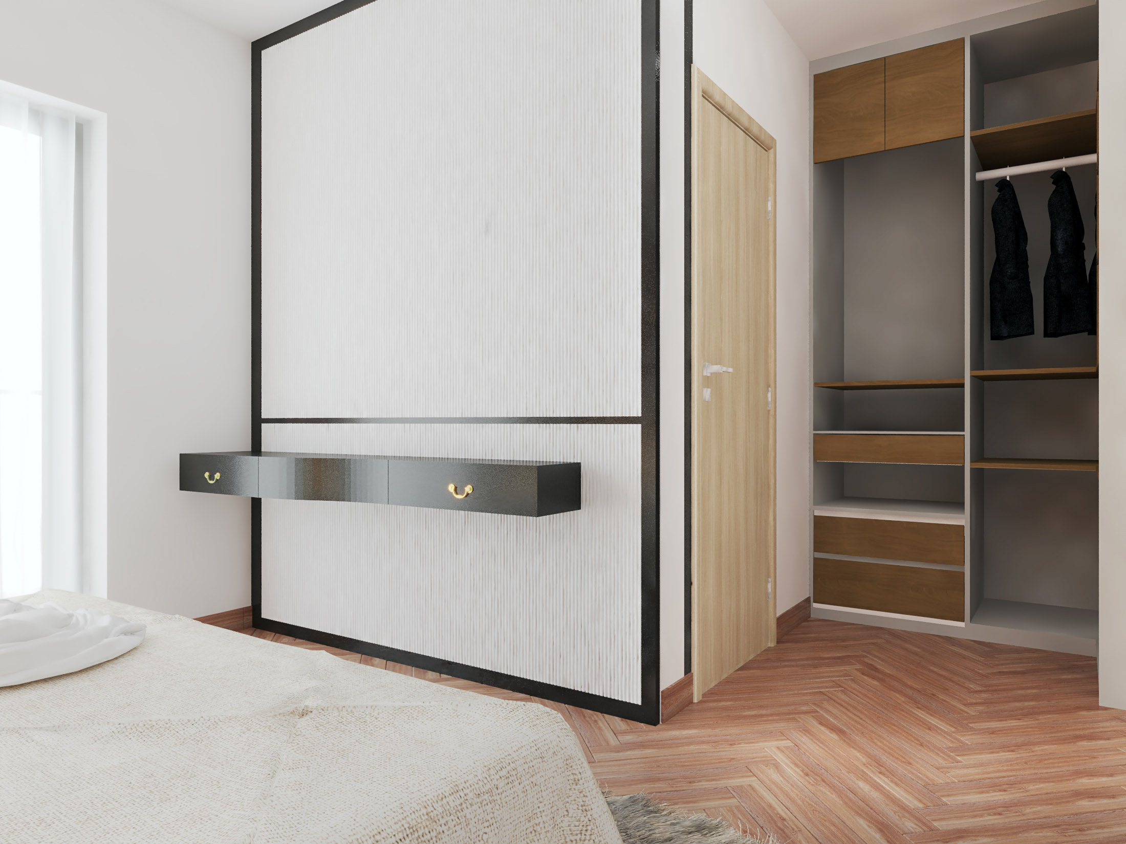 Do nhu cầu sử dụng của gia chủ cần đơn giản trong phòng ngủ, A2ZDecor chỉ làm nổi bật vách đầu giường, phần còn lại trang trí với mức tối giản.